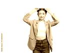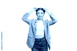 portrait Asian Woman winking and holding sunglasses. She is wearing a blue blazer and denim jeans on PNG