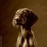 A Viszla dog looks off to the side with a thoughtful expression. The contrast of the green background and brown fur creates a harmonious composition.