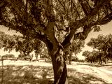Cork oak trees farm. Oak trunks are freshly stripped, revealing its reddish core.