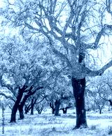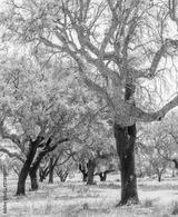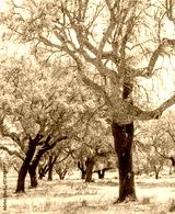 Cork oak farm. Oak trunks with renewable bark suitable for stripping in the nearest years.