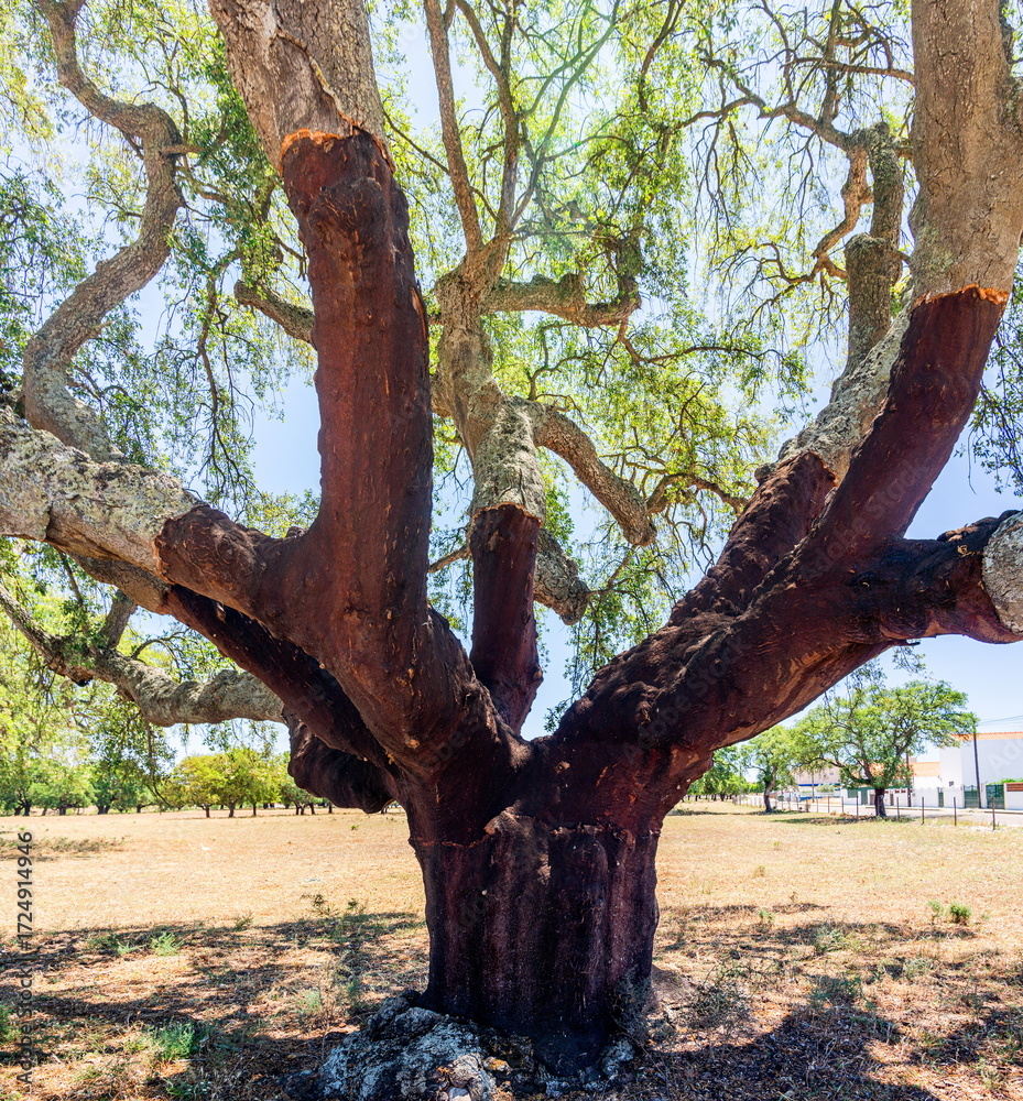 Cork oak trees farm. Oak trunk is freshly stripped, revealing its reddish core.