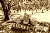 Corks on the piece of cork tree bark close-up. Cork oak orchard in the background.