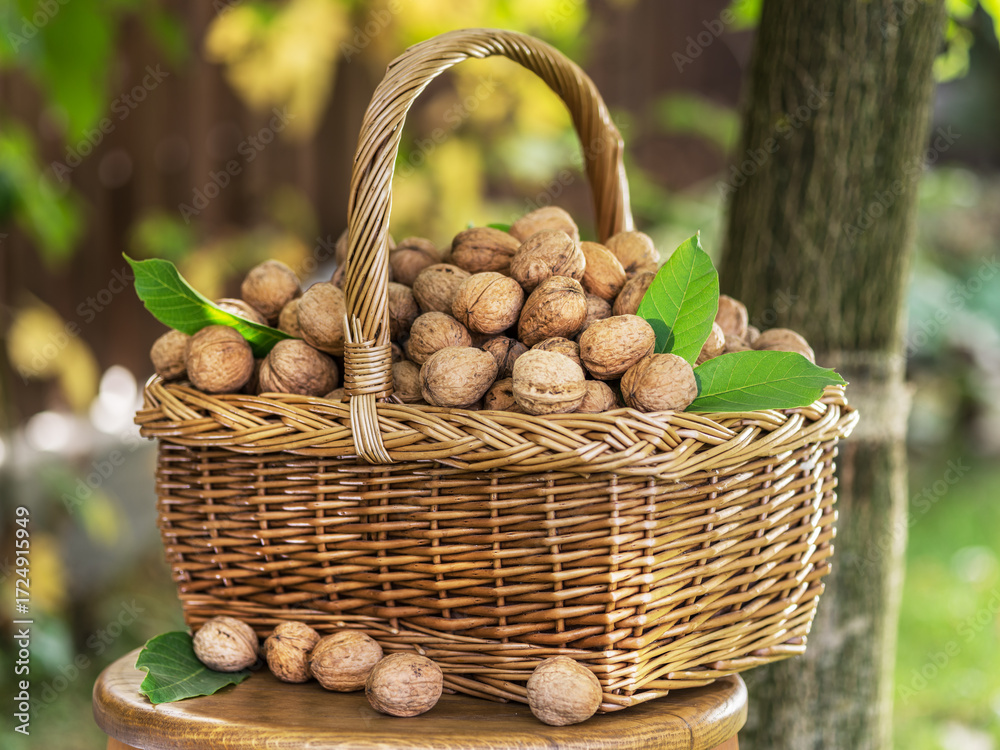 Walnuts and walnuts in green husk with green leaves on wooden table under the tree.