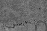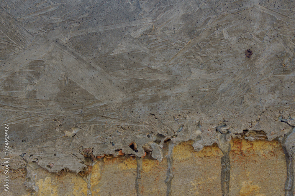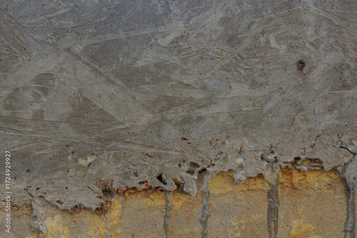 Textured concrete wall with rust stains and moisture marks. Surface contrast highlights industrial character and signs of aging.