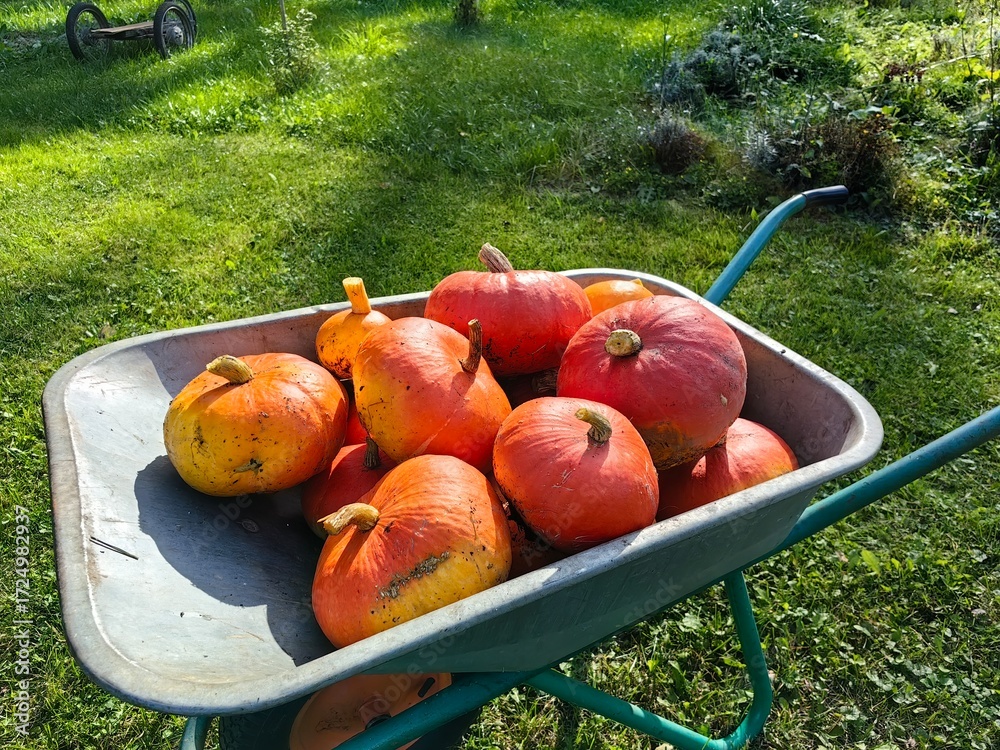 Pumpkins were harvested in the garden in the fall; the orange vegetables are sweet and healthy. Vitamin C in organic produce ensures a healthy diet.