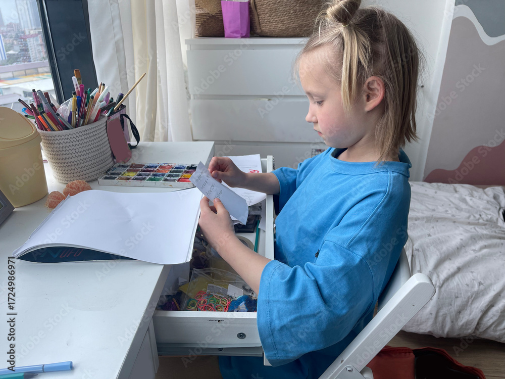Serious little child girl with opened empty sketchbook on table. Domestic life, leisure activity