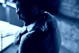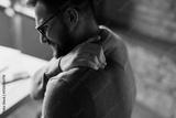 A man holding his shoulder in pain, showing discomfort and tension. The image depicts shoulder pain, muscle strain, or injury