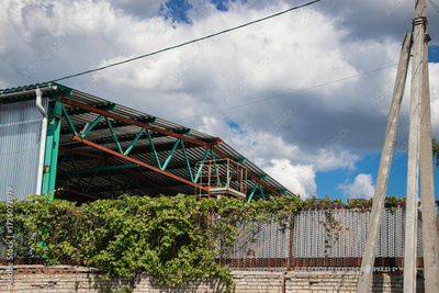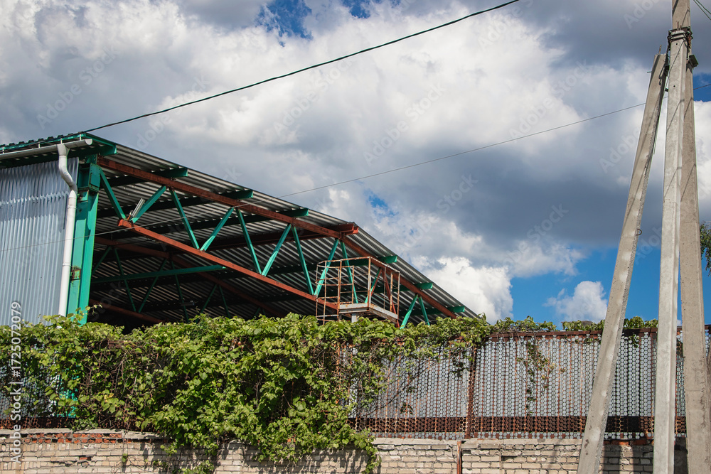 Construction of a warehouse with green framework under a cloudy sky in an urban environment