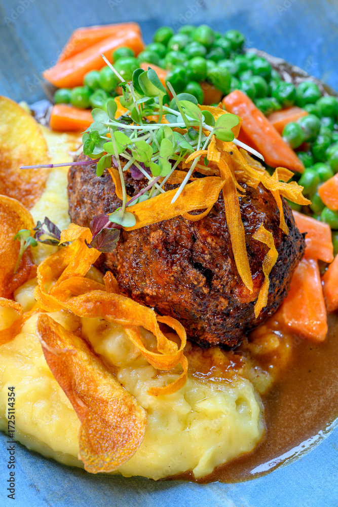 German-style meatball with mashed potatoes, gravy, and vegetables