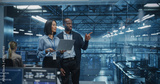 In a Modern Data Center, Black Male Data Scientist and Asian Female AI Specialist Analyze Algorithms on a Laptop. Specialists Exploring Optimizations for Processing Large Datasets