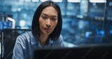 Asian Software Developer Analyze System Performance Metrics on a Computer Inside a Modern Data Center. Young Female Manager Ensuring Efficient Operations for Critical Infrastructure