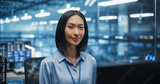Portrait of a Data Center Administrator Working Behind a Desk, Optimizing Server Configurations on a Desktop Computer. Beautiful Female Specialists Looking at Camera and Smiling