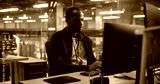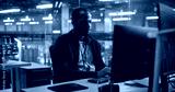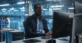 Portrait of a Dedicated Data Scientist in a Data Center Office, a Black Man Concentrates on His Work on a Computer, Managing System Security and Processing Key Information Online