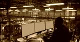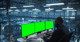 Male Software Engineer Focused on Working on Computer with Green Screen Mock Up Monitors. Black Specialist Analyzing Data Outputs and Tweaking Parameters