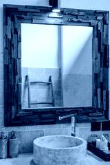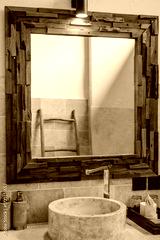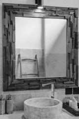 Vertical image of a bathroom interior design made with natural elements like wood, granite and stone with mirror and sink and bathroom decoration inside a hotel room with natural light.