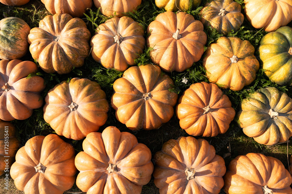 A lot fresh colorful varieties orange pumpkins and squashes on a farm field for Halloween, background and texture. Autumn rustic decorations at home. Pumpkins on farmer agricultural market. flat lay