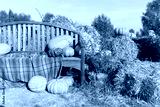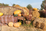 Wooden bench with plaid, many orange pumpkins and haystacks in fall garden. Autumn cozy outdoor relax. Decorated fall yard at home with pumpkins and plant in pot. Thanksgiving. Halloween pumpkins