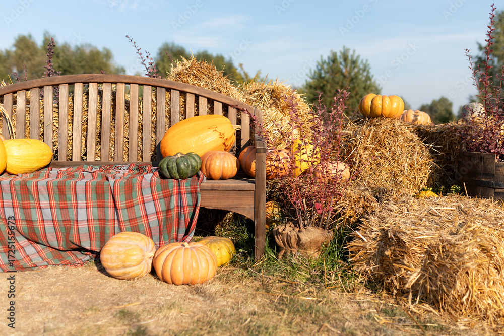 Wooden bench with plaid, many orange pumpkins and haystacks in fall garden. Autumn cozy outdoor relax. Decorated fall yard at home with pumpkins and plant in pot. Thanksgiving. Halloween pumpkins