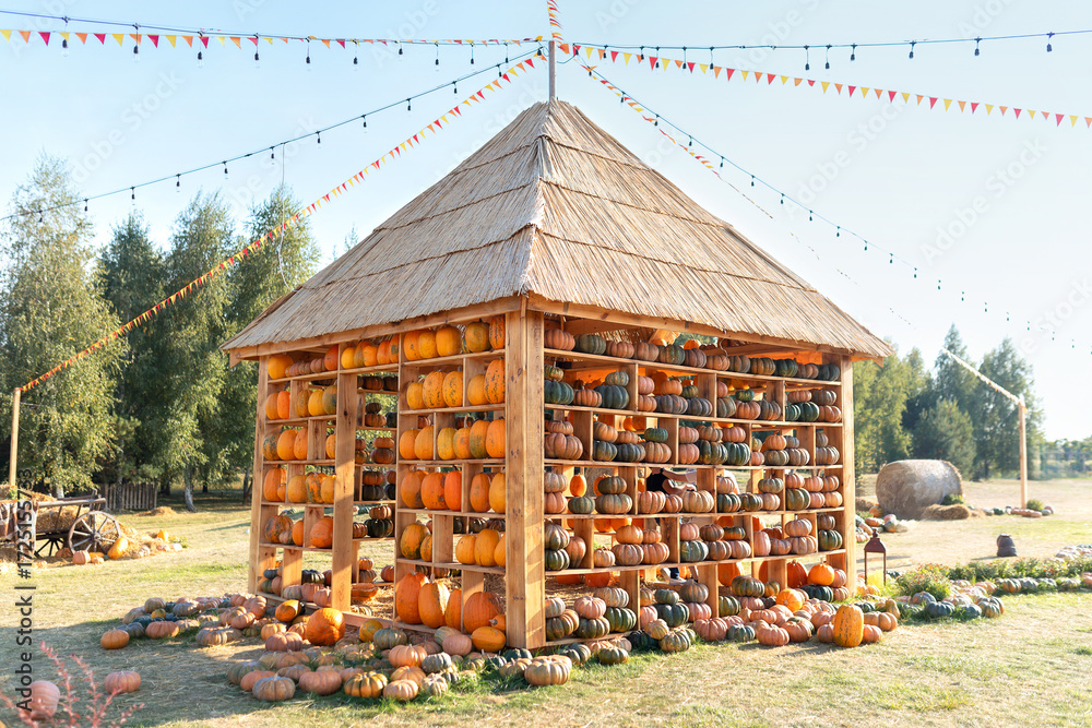 Decoration home Halloween or Thanksgiving celebrations. Interior fall house decorated from pumpkins as shelves at harvest festivals. Pile of pumpkins at the autumn farm harvest market.