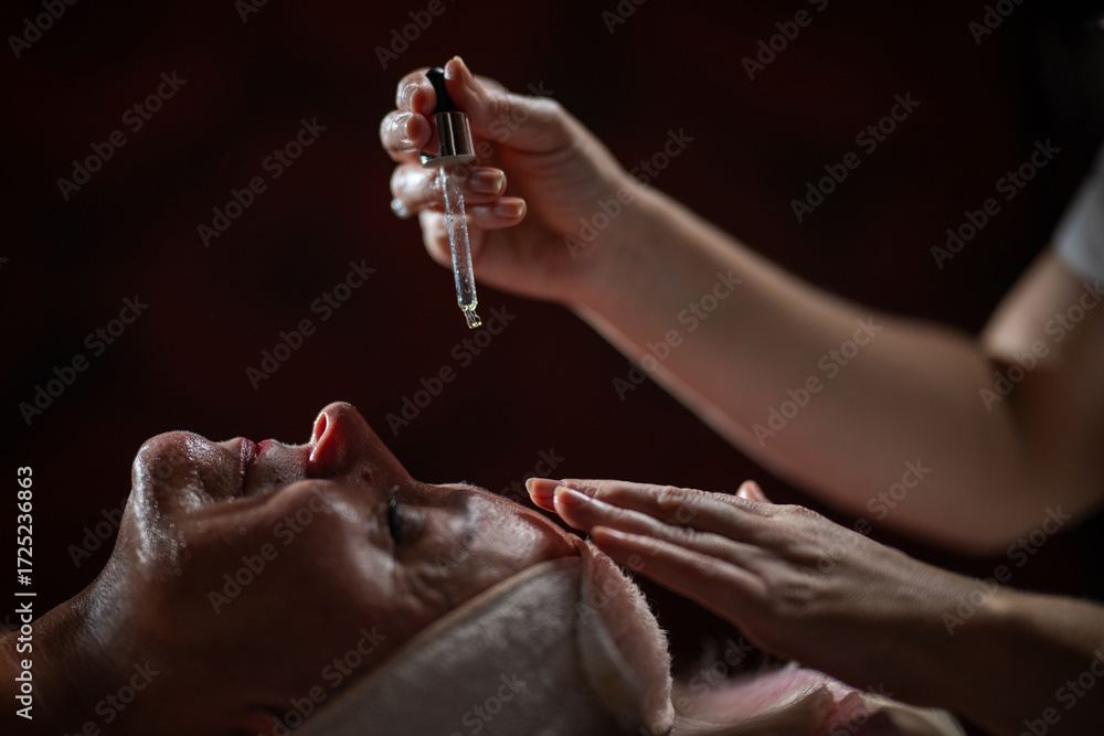 Close up of a mature woman lying in a spa while a therapist applies skincare serum with a dropper above her face. Beauty and wellness concept highlighting anti aging treatment, hydration, and holistic