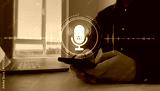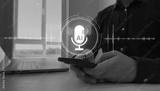 AI assistant voice chat interface.Person interacting through microphone with AI voice chat. Digital communication, speech recognition, and smart technology enabling natural conversation.