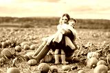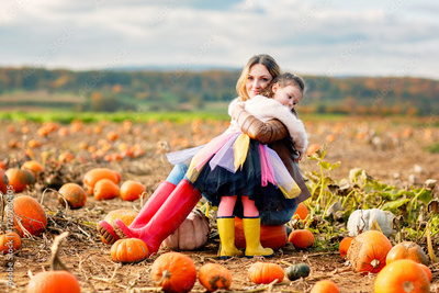Little preschool girl and young mother on pumpkin patch with lots of pumkins in autumn field. Happy child and woman, family enjoying harvest season outdoors. Real life, real people.