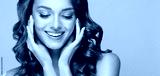 Beautiful Young Woman with Clean Fresh Skin touch own face . Facial treatment . Cosmetology , beauty and spa