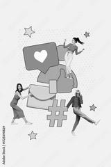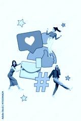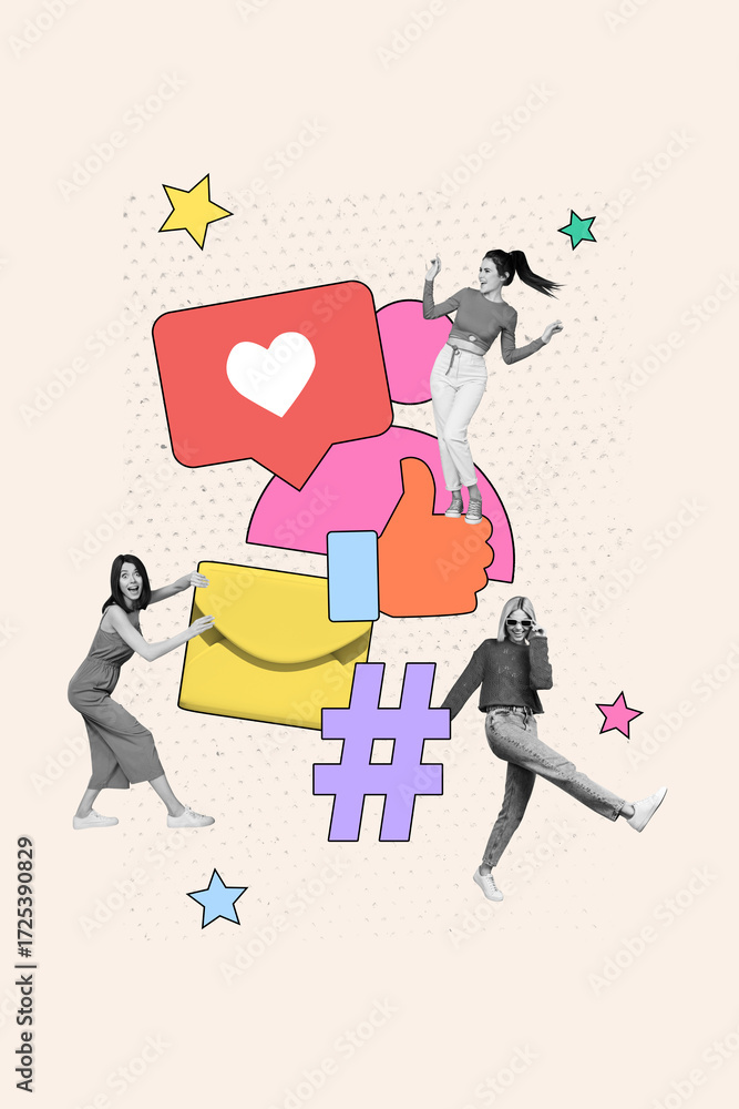 Template poster trend 3D photo collage of thumb email hashtag heart chatting blog notification share three young lady friends dance smile