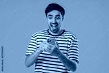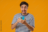 Shocked young Slavic man staring at smartphone on yellow studio with open mouth
