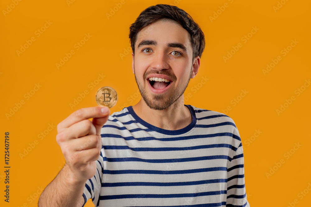 Man With Bitcoin, Crypto Currency. Golden Coin On Yellow Background.