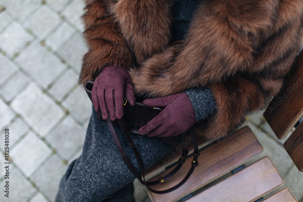 Woman wearing fur coat, suede gloves and holding woven leather trendy brown handbag, autumn winter street style outfit