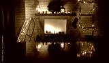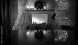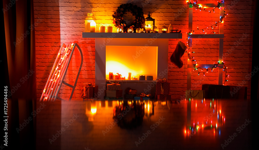Festive holiday interior with warm Christmas and winter accents, cozy decorations and joyful atmosphere. Table with copy space for product placement or text. Christmas marketing, seasonal advertising.
