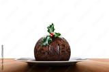 A level view of a traditional Christmas pudding on a round plate with a sprig of holly and berries on top on a wooden table isolated against a transparent background.