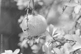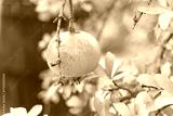 Ripe pomegranate hanging on a tree branch in a garden during harvest. Bright natural colors with blurred background create a holiday orchard scene.