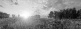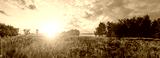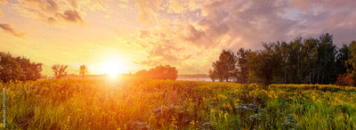 Golden sunset or sunrise over a field of wild grasses and flowers in summer. Rural landscape at dusk with forest and sky. Fog over the trees in the distance.
