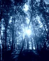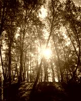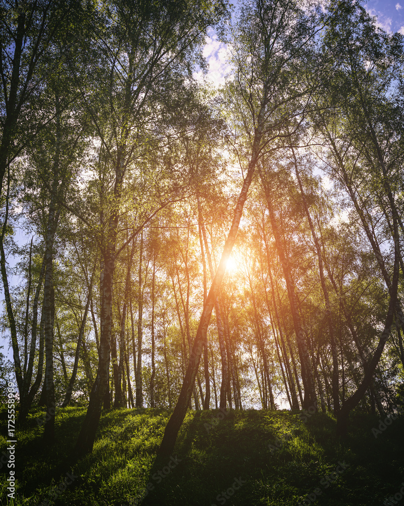 Sunlight filtering through the tall birch trees in a lush green forest, creating a serene and captivating natural landscape for nature enthusiasts. Vintage film aesthetic.