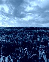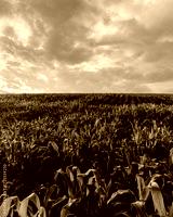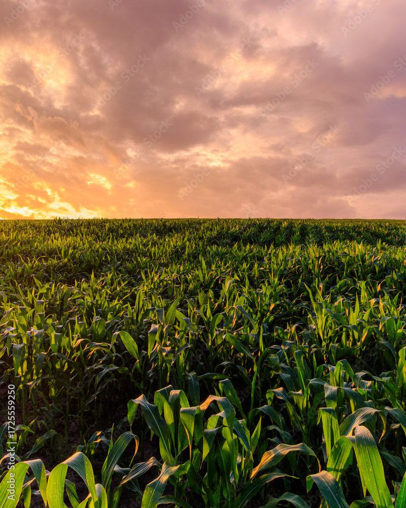 Green corn field with a radiant sunset over the horizon, capturing agricultural growth and the beauty of rural landscape.