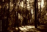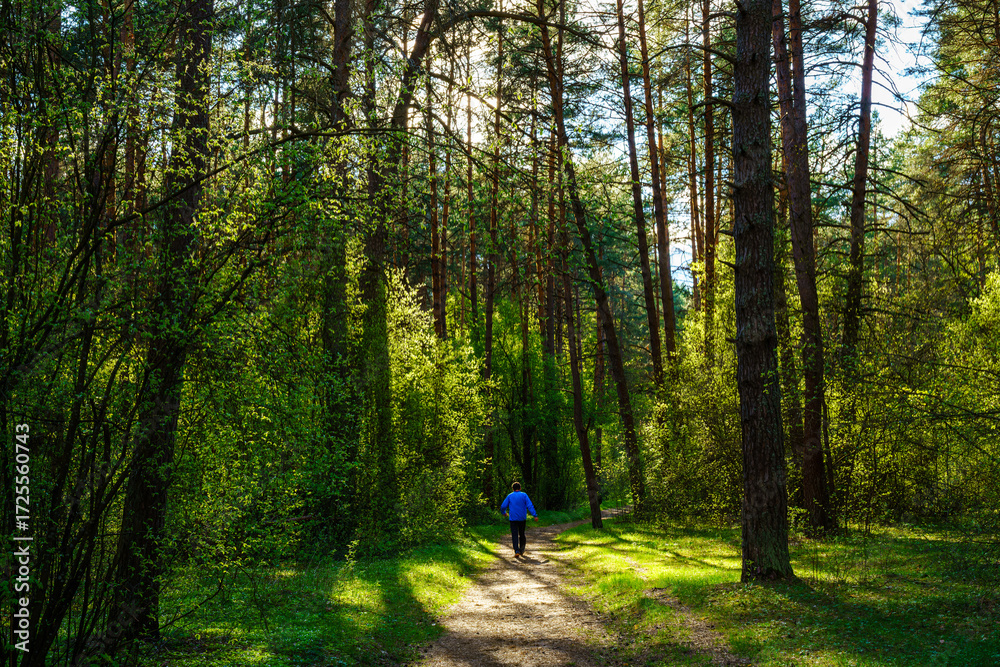 Man walking on a sunlit dirt path in a green forest. Summer forest scenery for nature background or outdoor activity concept.