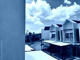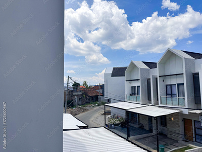 Clean and modern contemporary white real estate building. Vibrant blue sky with fluffy white clouds over modern residential homes, showcasing a peaceful neighborhood scene. Minimalist photography.