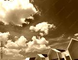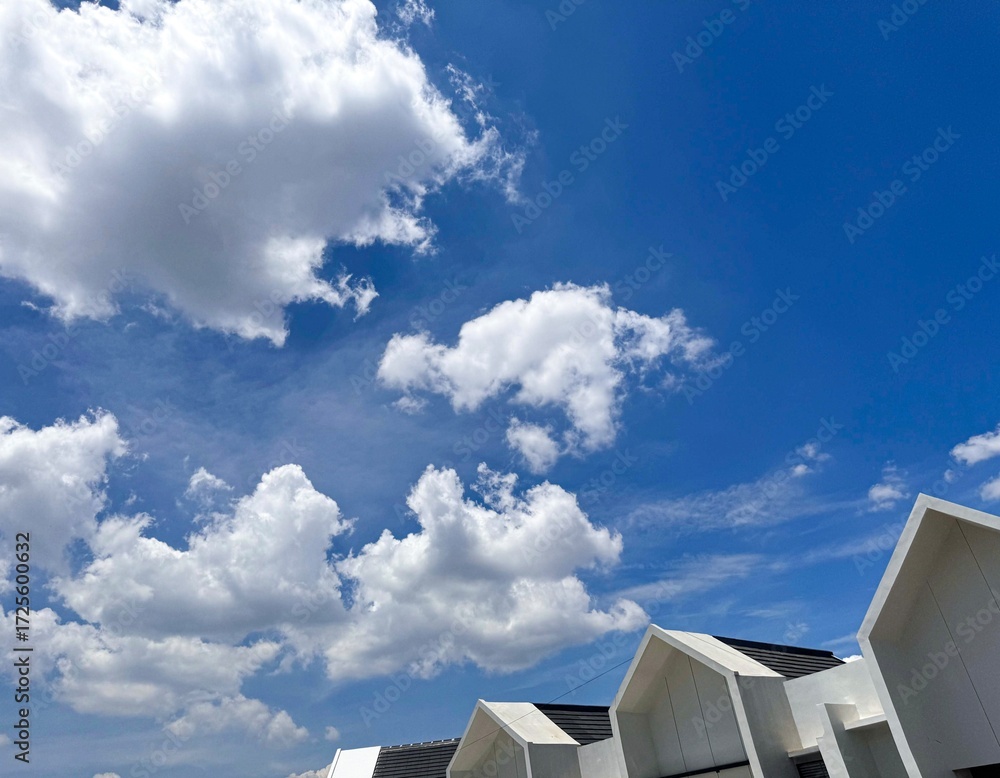 A row of modern white houses with unique gable roofs against a bright blue sky with scattered clouds.