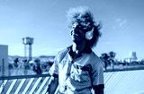 Smiling young man with curly afro listening to music on wireless headphones, looking up joyfully, symbolizing personal connection with audio, digital entertainment, and modern lifestyle.