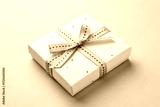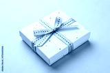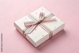Gift box with colorful ribbon on pastel pink background. Celebration minimal style.