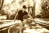 child boy in sportswear playing basketball game outside