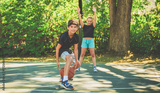 two childs in sportswear playing basketball game outside