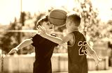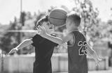 two brother in sportswear playing basketball game outside