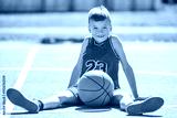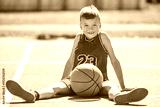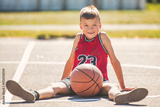 child boy in sportswear playing basketball game outside