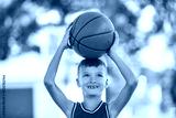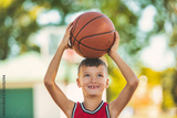 child boy in sportswear playing basketball game outside