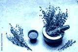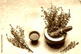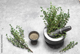 Fresh and dried thyme on stone background