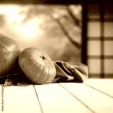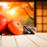 Pumpkins on the table with blurred Japanese autumn garden outside big window - fall lifestyle and autumn background with copy space.