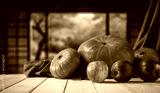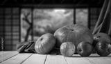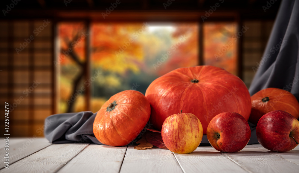 Pumpkins on the table with blurred Japanese autumn garden outside big window - fall lifestyle and autumn background with copy space.